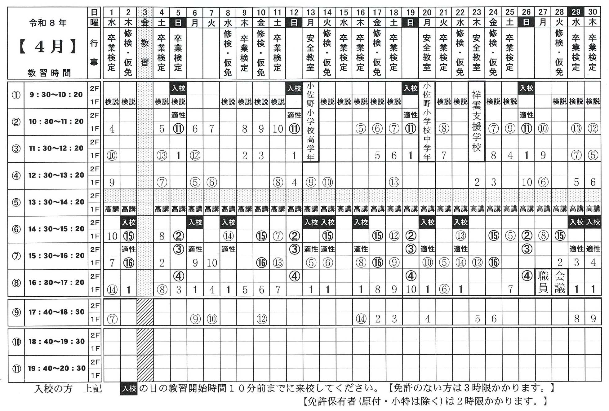 4月の予定表を更新しました。教習案内にてご確認ください。